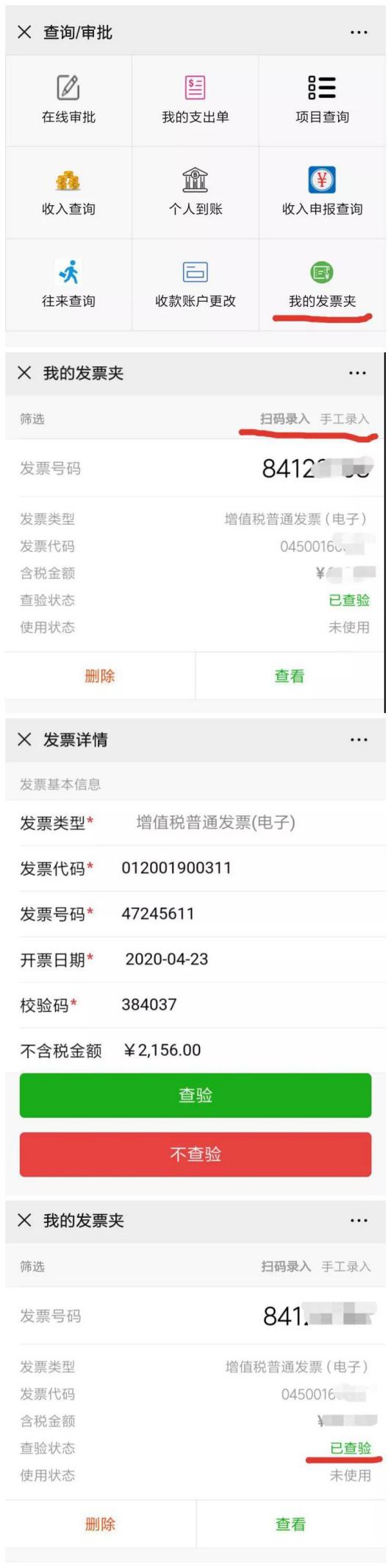 提示:各位报账人员可通过财务系统移动端和网页端进行发票查验,以便提高财务报销效率。使用经过财务系统查验的增值税发票报销时,报销业务单会显示出查验结果,报销人员将不需要在国家税务总局全国增值税发票查验平台进行查验和打印查验结果!!!