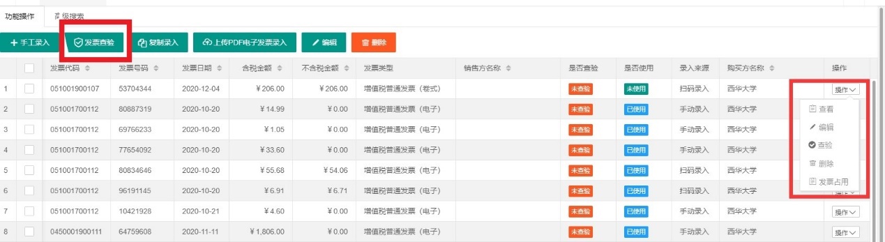 (3)选择【查验】,自动获取到销售方和购买方名称,即表示发票查验结果为真。点击【保存】后即可使用该张发票报销。查验成功后会显示查验状态:“已查验”。