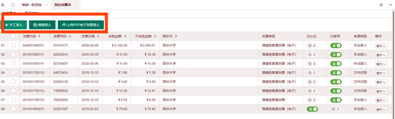 ②上传PDF电子发票录入(主要是指使用电子发票的情况下可以直接上传PDF版,系统会自动解析发票信息,点击“保存”,勾选相应发票后点击“操作”