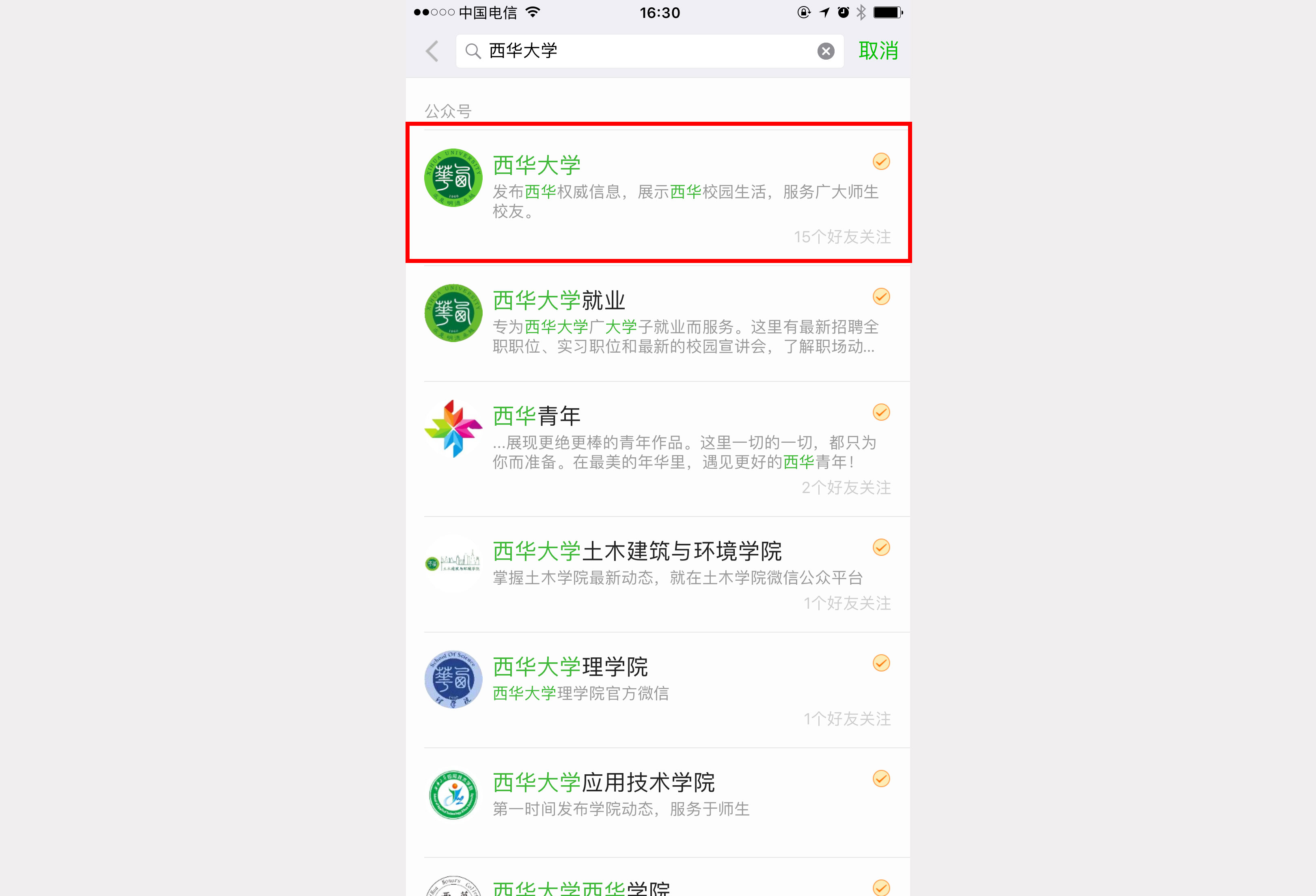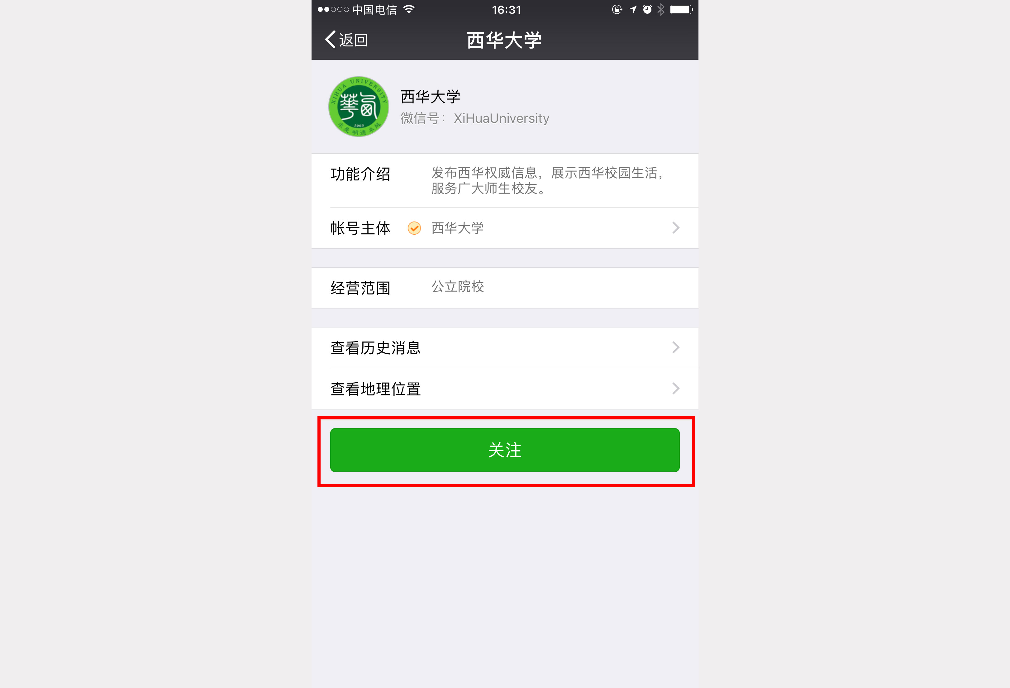 1.4.进入公众号主界面,点击菜单进入“西西互动”“缴费大厅”